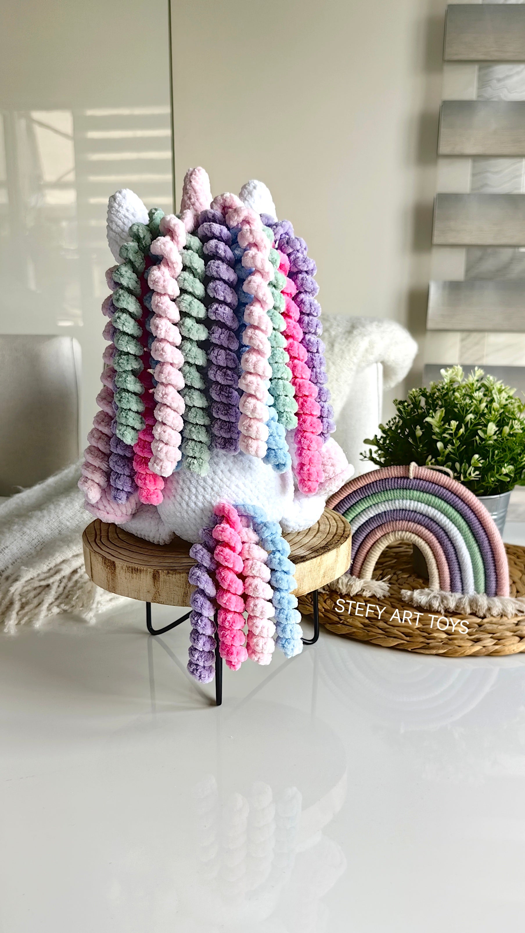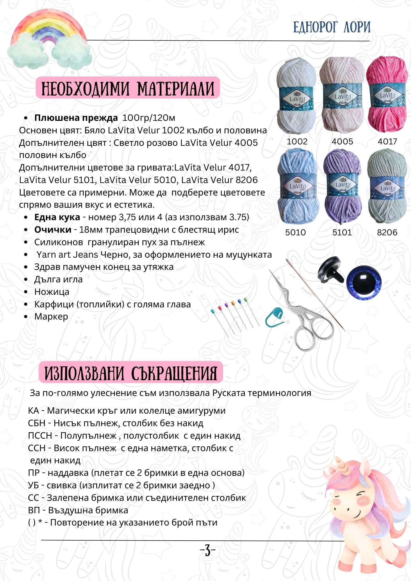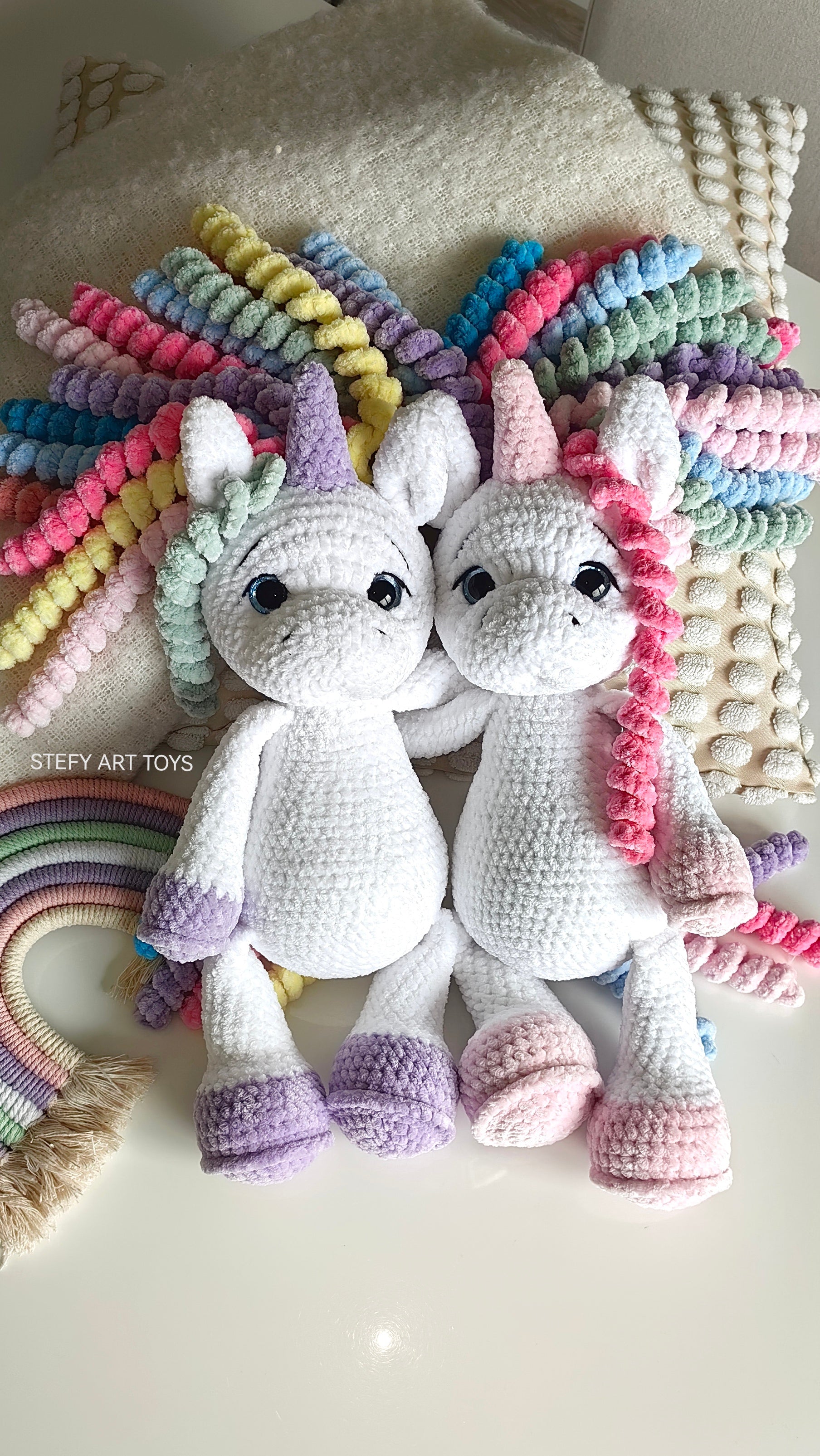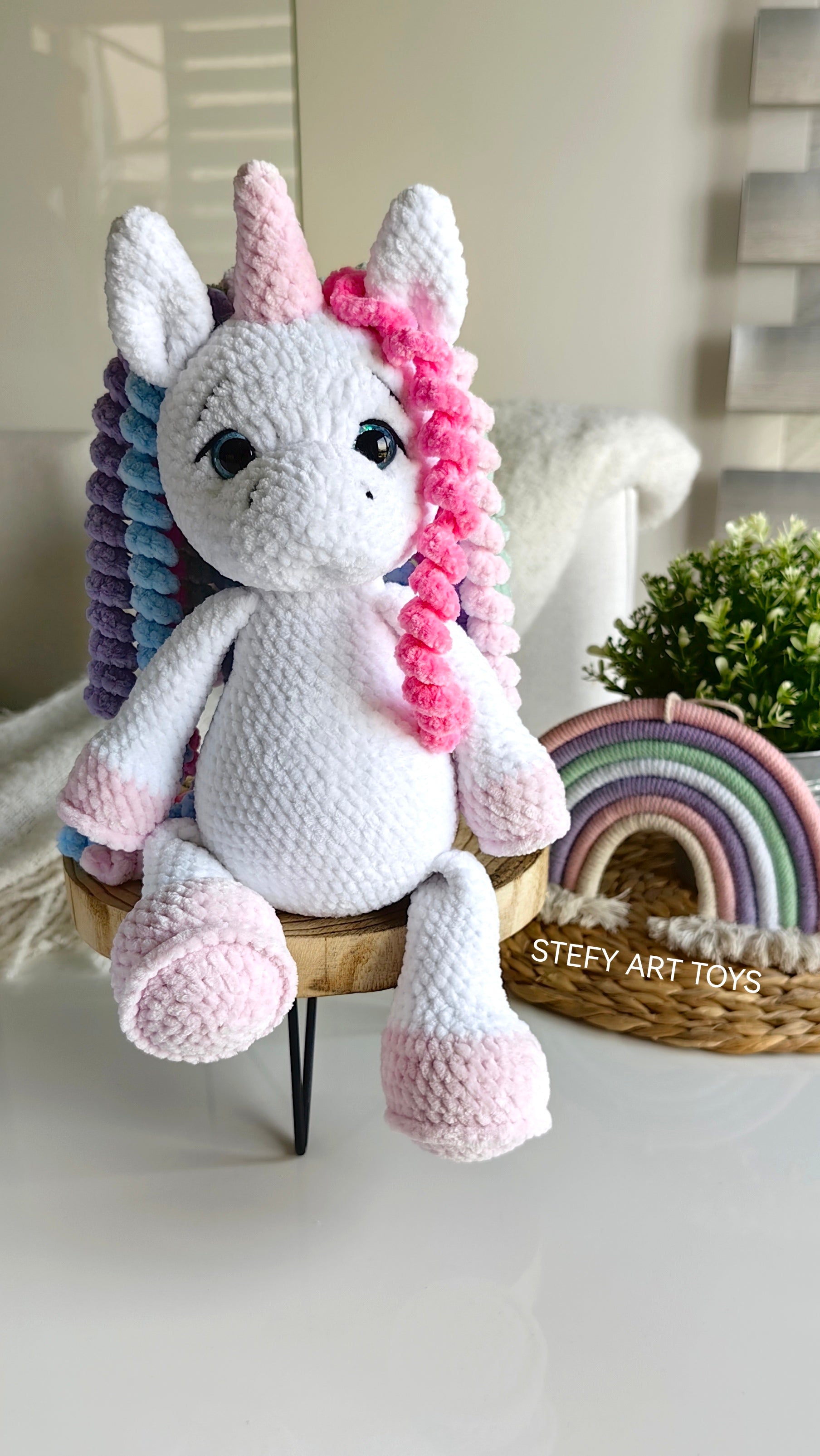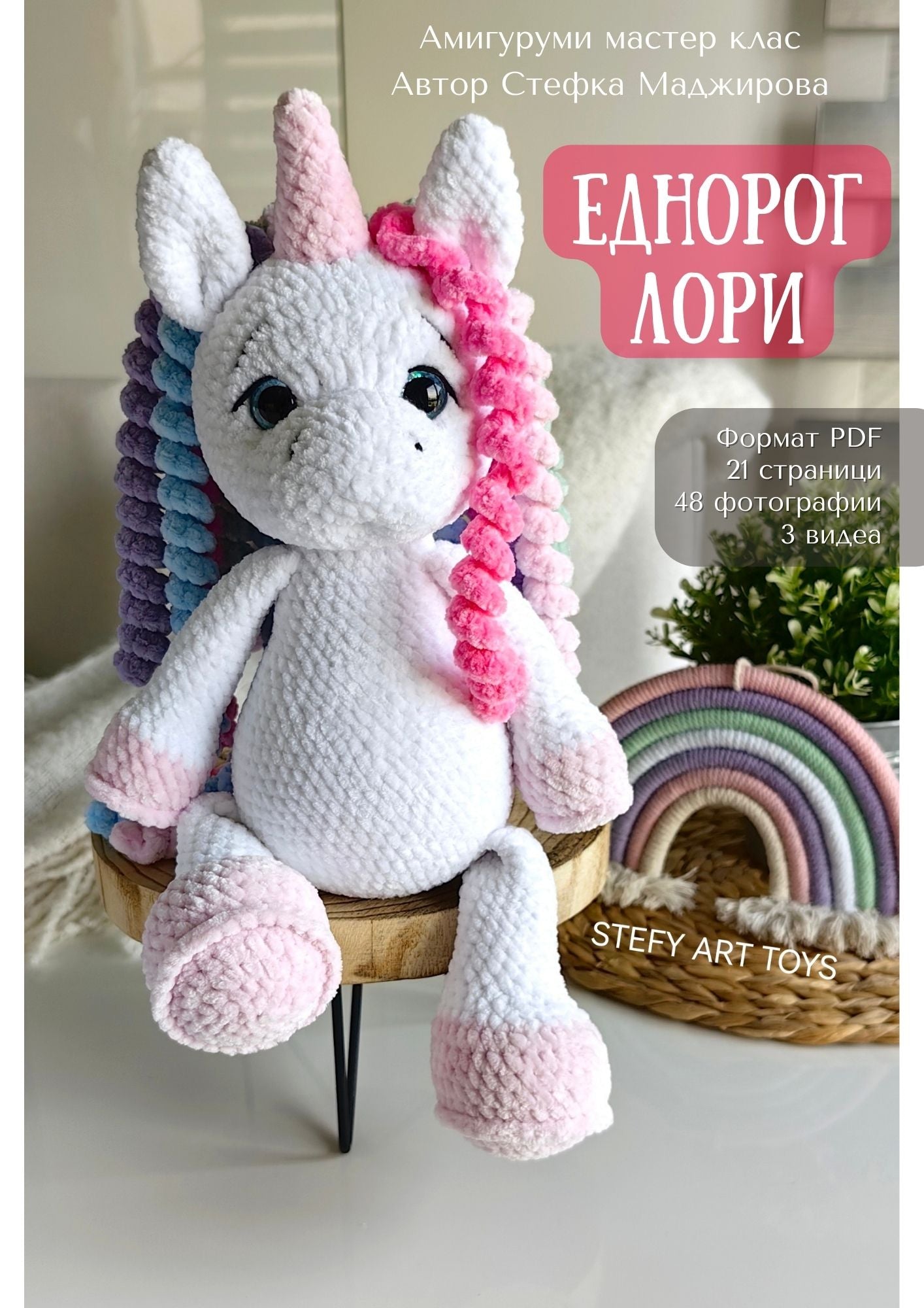 Този подробен Мастер клас съдържа 21 страници, 48 снимки и 3 видеа. В готов вид еднорога е висок около 40 см. Изработено изцяло от плюшена прежда. Крачетата и ръчичките се вплитат в тялото. Пришиват се главата, рога, ушите.