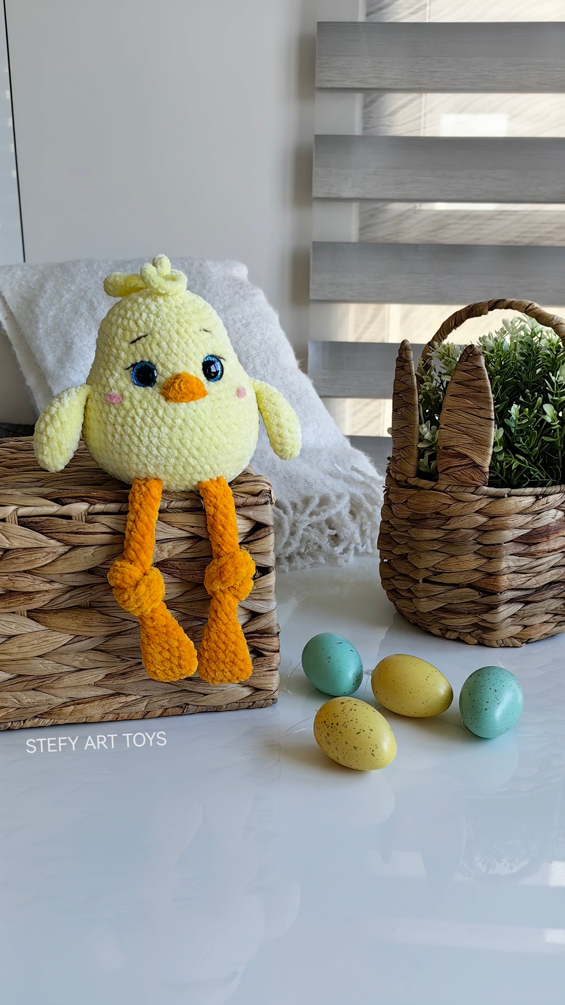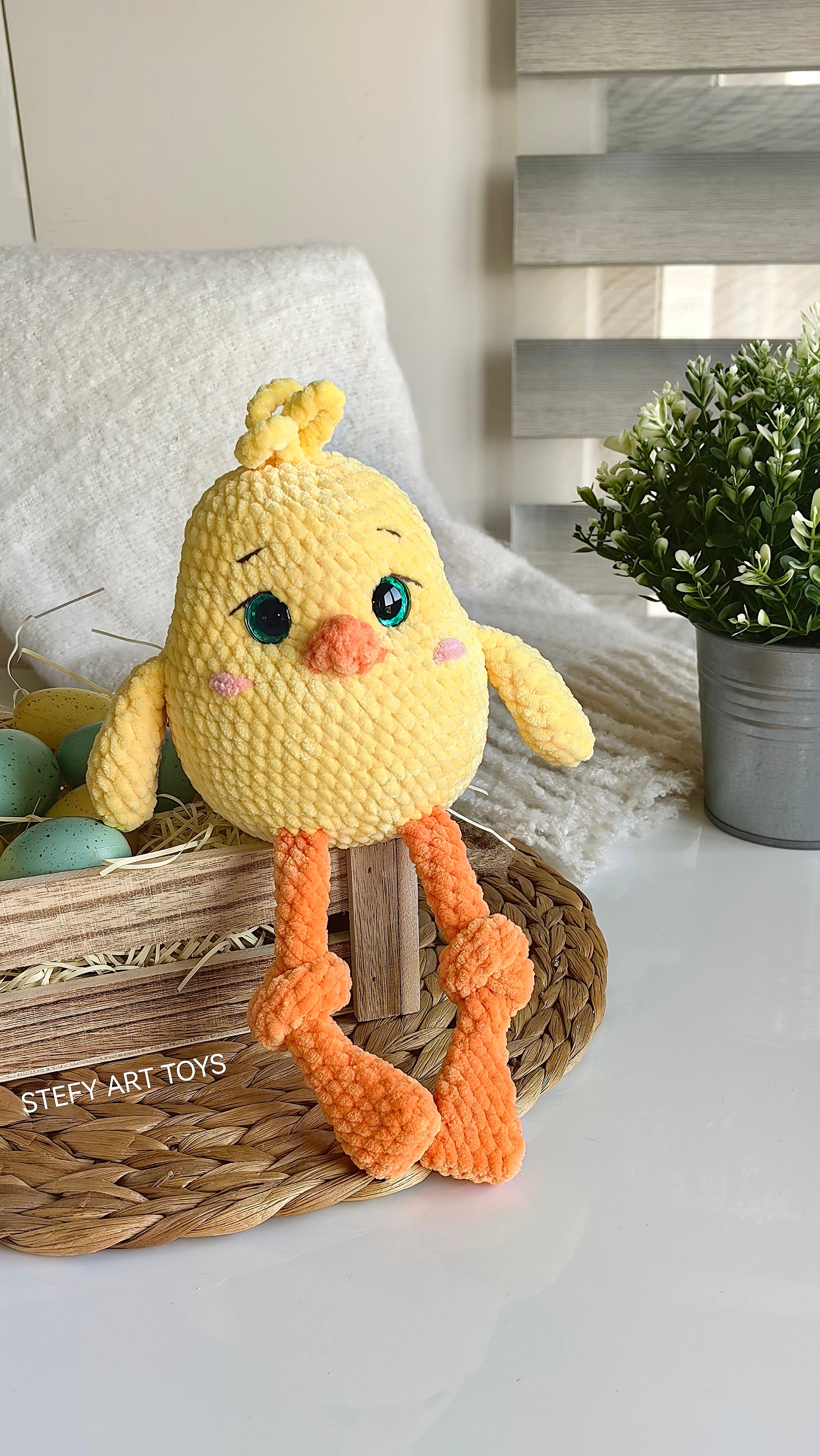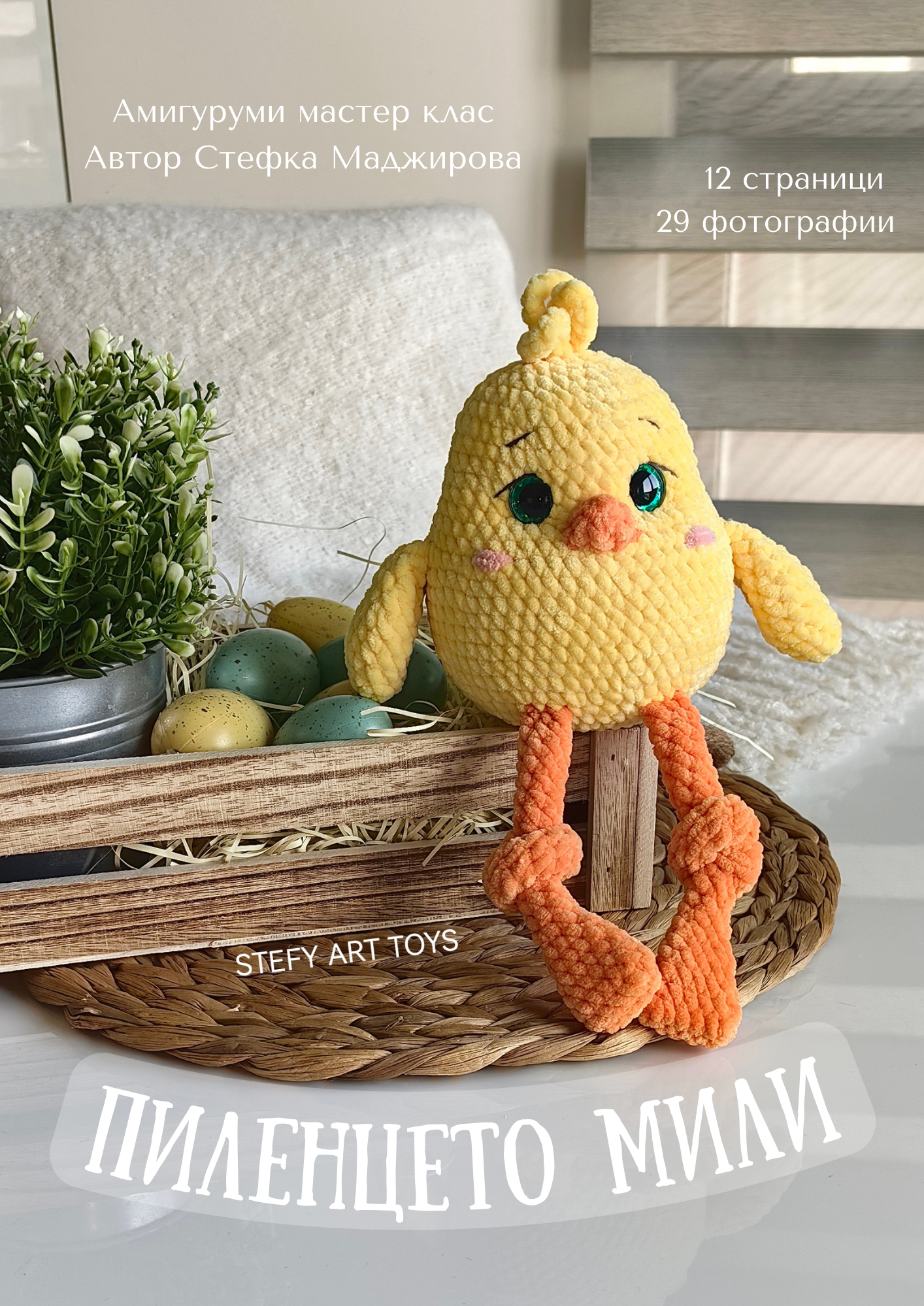 Пиленцето се получава 28-29 см на височина, заедно с крачетата. Изработено е от плюшена прежда. Тялото и главата се плетат заедно. Крачетата и крилцата се вплитат в тялото. Пришиват се само клюна. Идеално за великденска декорация.