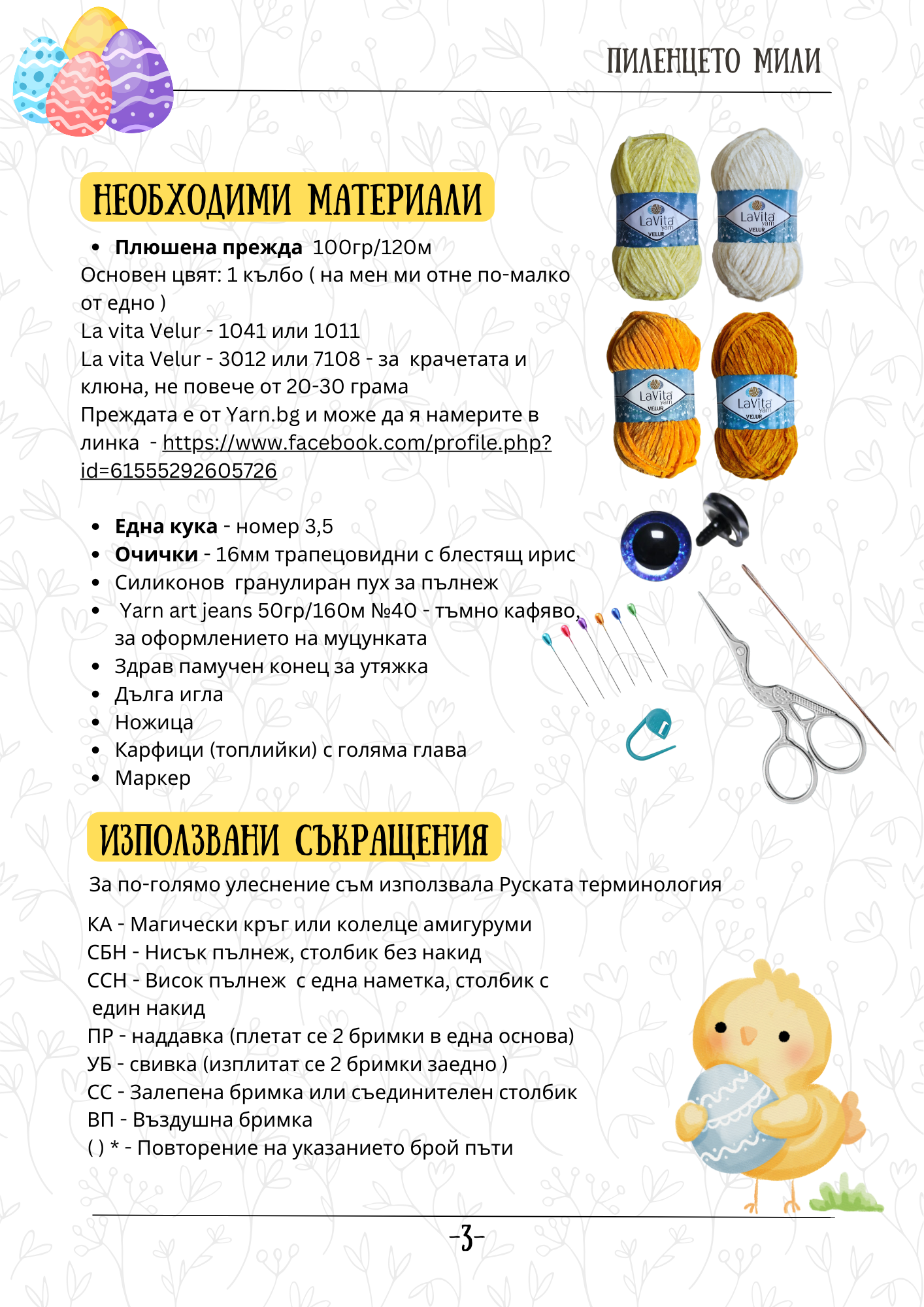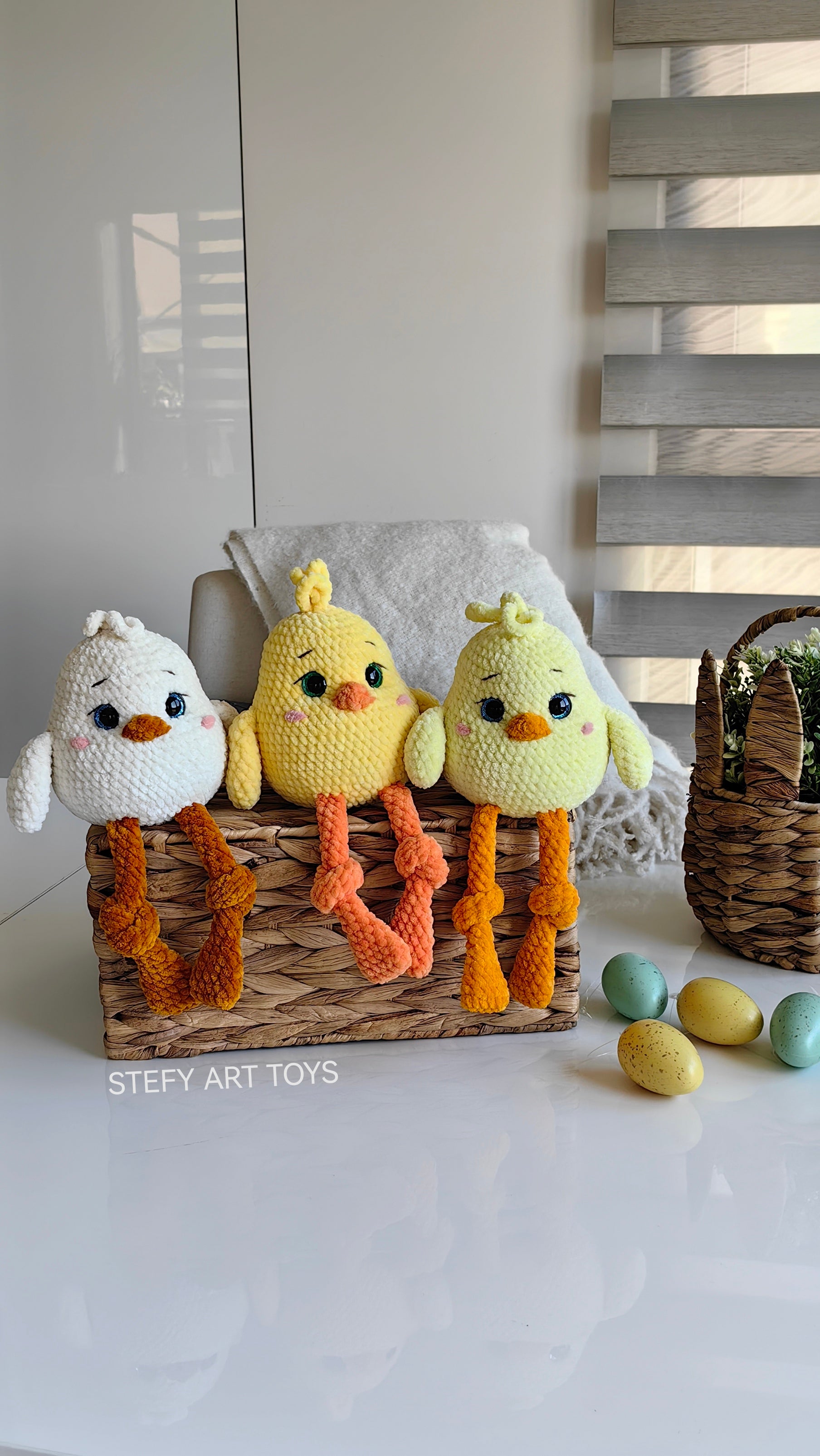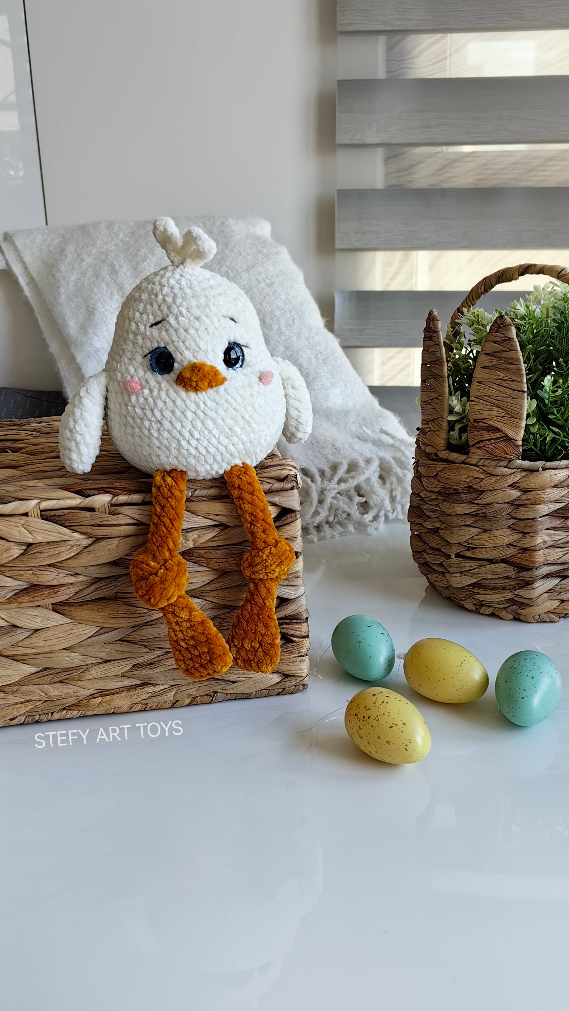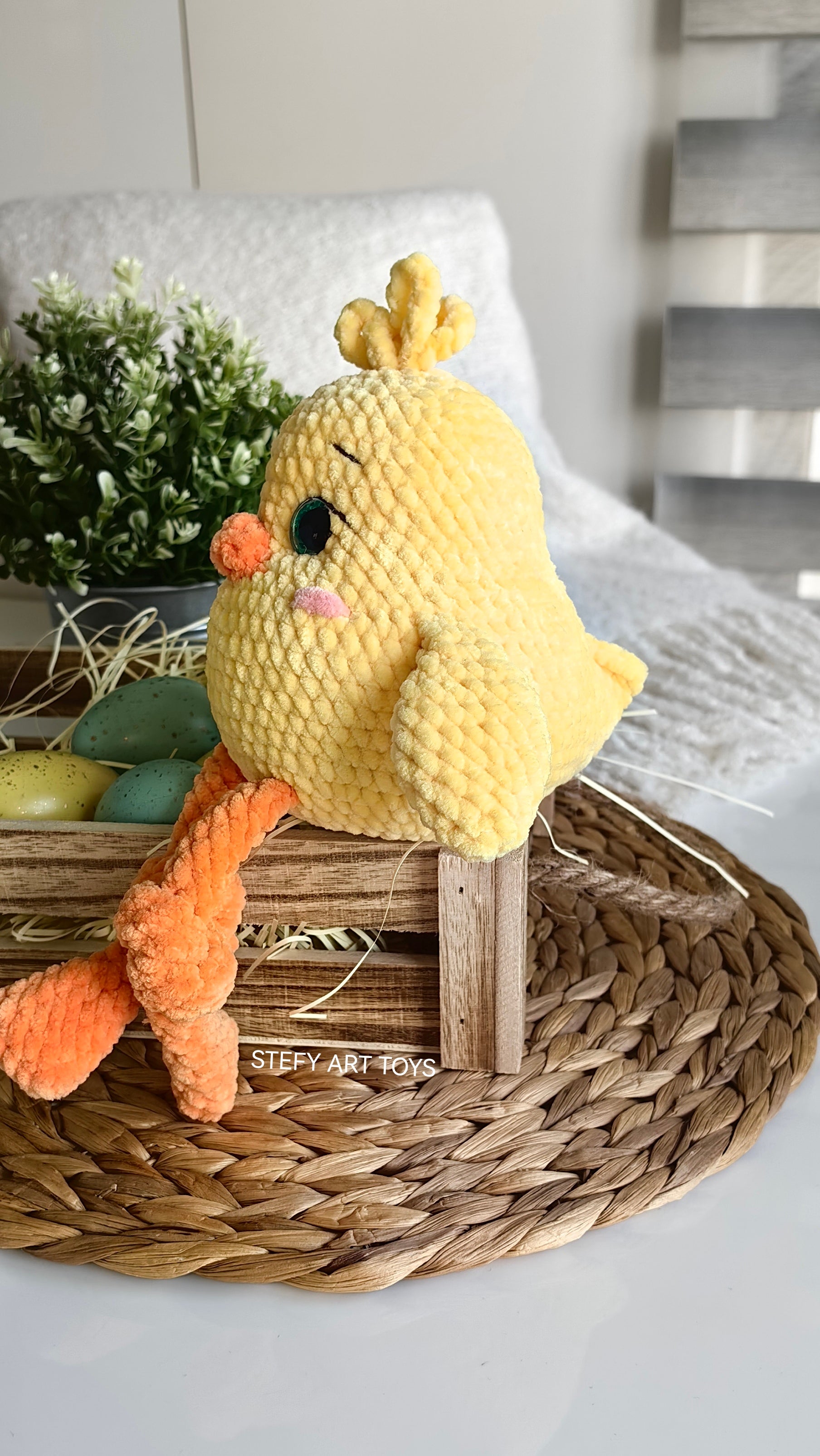 Пиленцето се получава 28-29 см на височина, заедно с крачетата. Изработено е от плюшена прежда. Тялото и главата се плетат заедно. Крачетата и крилцата се вплитат в тялото. Пришиват се само клюна. Идеално за великденска декорация.