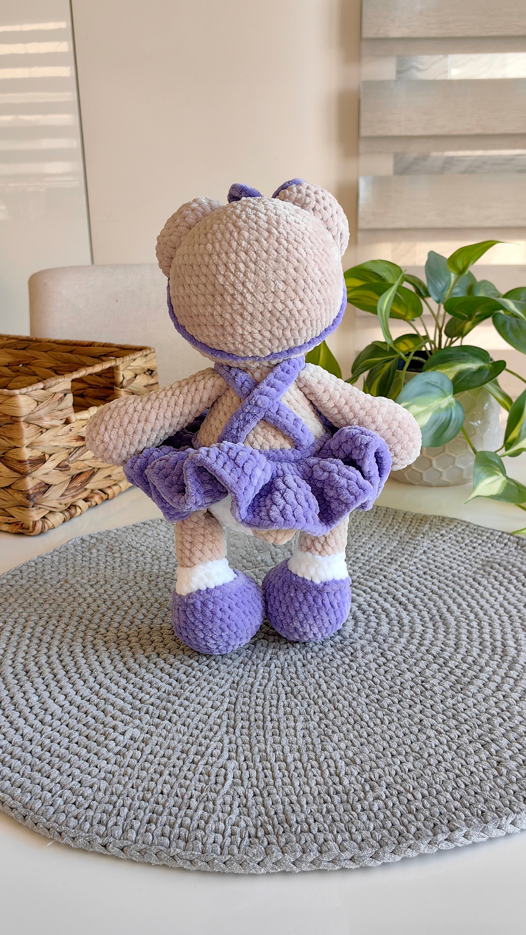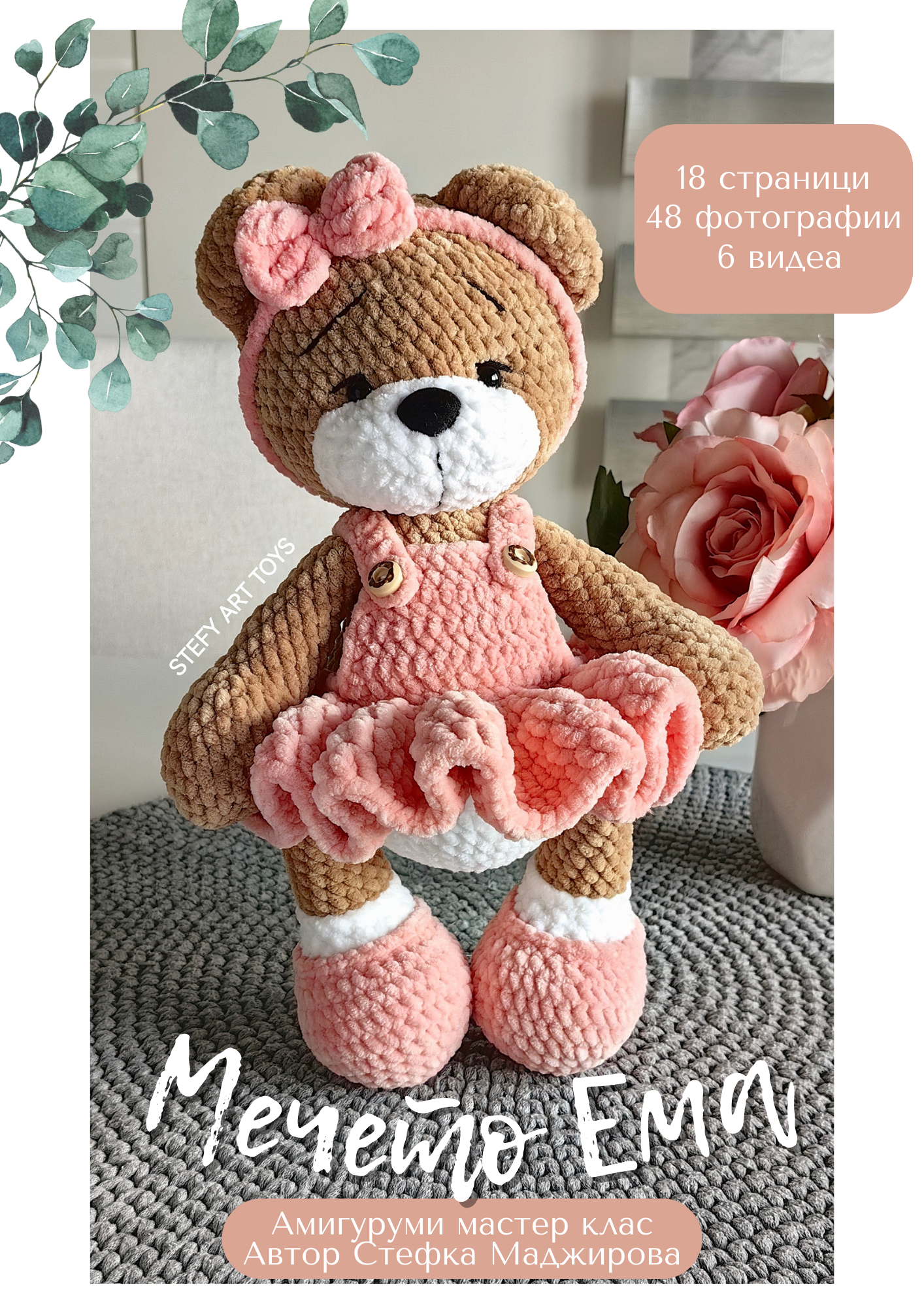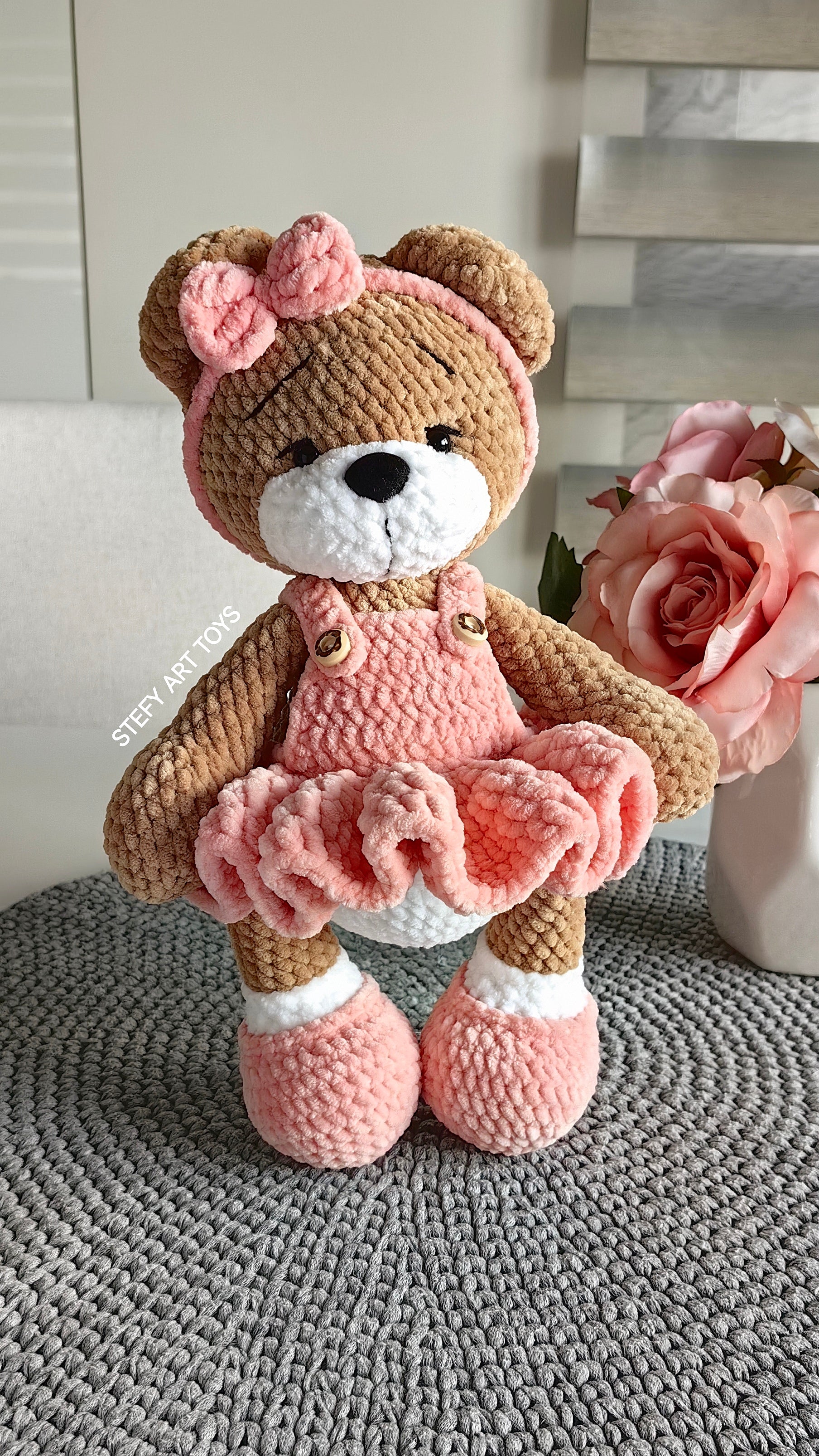 Мечето се получава 33-34см на височина. Изработено е от плюшена прежда. Тялото и главата се плетат заедно. Крачетата и ръчичките се вплитат в тялото. Ушите и муцунката също се зашиват. Рокличката се плете заедно с тялото и не се сваля.
