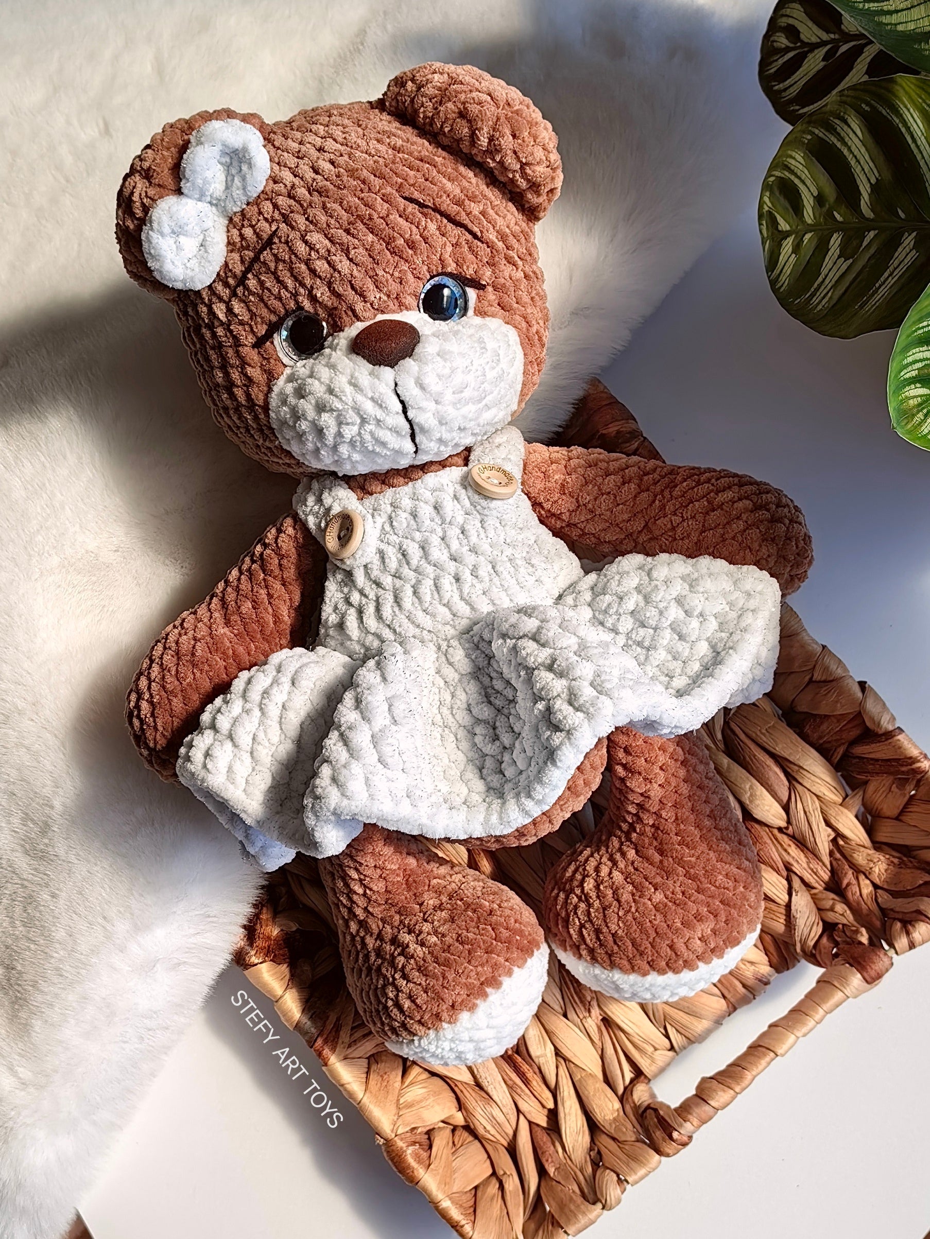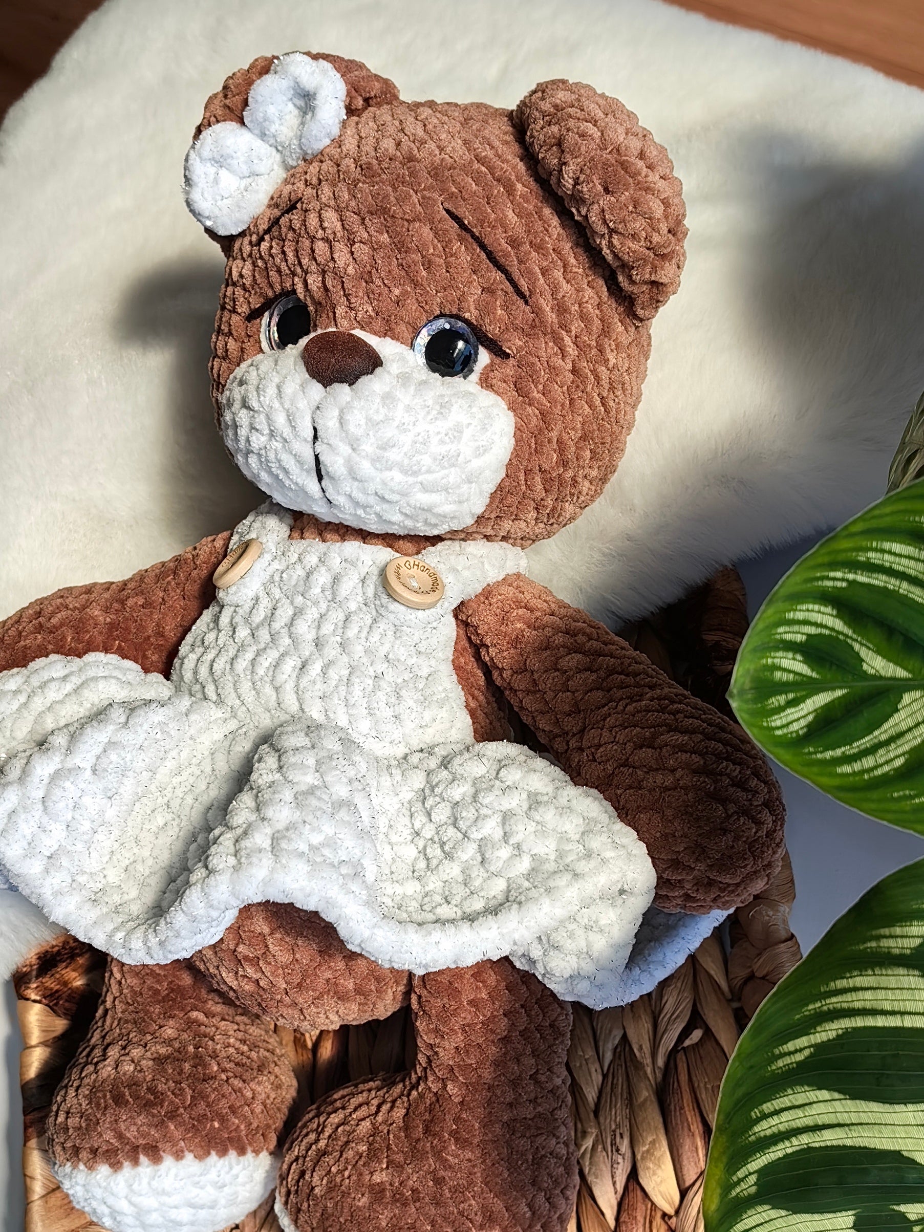 - Изработено от микрополиестерна хипоалергенна прежда и пълнеж от силиконов пух, очички и носле на щифт;